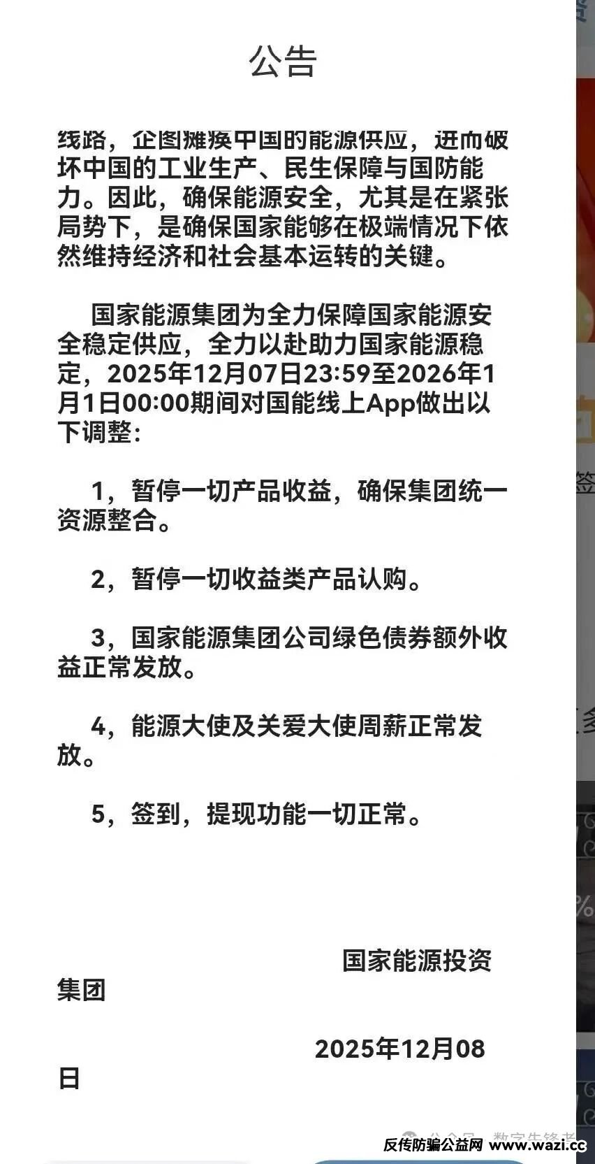 2025年12月8日,一则“停止一切收益”的公告,让火爆数月的“国能App”彻底露出骗局真面目。这个冒用国家能源集团名号的资金盘,以“央企背书、日息1.5%、保本保息”为诱饵,短短数月吸纳资金近20亿元,波及受害者超18万人,如今平台停付、客服失联,只留下满屏的“提现失败”和无数家庭的破碎。