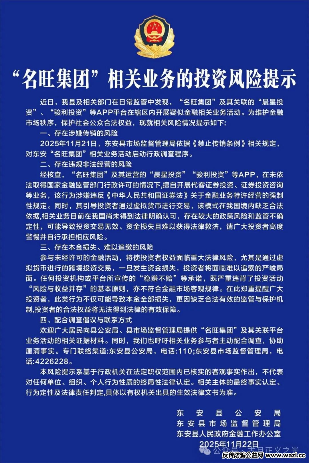 对于此骗局东安县公安局也发布了关于此盘的相关业务的投资风险提示如下,文中明确指出经核查,“名旺集团”及其运营的“晨星投资”“骏利投资”等APP,在未依法取得国家金融监管部门行政许可的情况下,擅自开展代客证券投资、证券投资咨询等业务,该行为涉嫌违反《中华人民共和国证券法》关于金融业务特许经营的强制性规定。