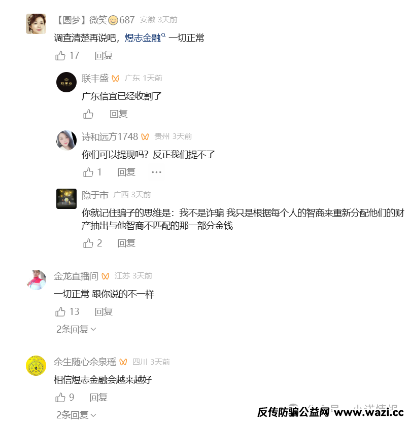 本来小诺以为煜志金融目前处于提现困难的状态下,应该大部分的参与者都醒悟过来了。但是小诺今天在网上搜索该项目的相关文章,看到还有很多参与者在媒体曝光文章下面留言,说项目不会崩盘类似的话。对于这样的参与者,小诺也是无语,资金盘在国内兴起到现在已经有十多年的了,崩盘或者被抓的项目不计其数,怎么现在还有人这么死心塌地的相信呢!每次看到这样的傻韭菜,小诺都有自己起盘子的冲动。难怪资金盘屡抓不净,就是因为这个钱太好骗了。操盘手骗了你,你还帮人家数钱呢!几万块钱买了APP,随便换个UI,模式都不用换,随随便便收割上千万。稍微包装一下就能收割上亿。在现在经济环境不好的情况下,资金盘还是屹立不倒,怎么推都有人投资。钱越难赚,玩盘的人越多,大家都想赚轻松的钱,这也是资金盘火爆的原因之一。
