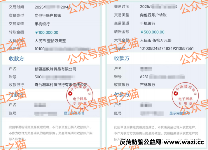 其中连续入金的公户来自新疆奇台县的利丰村镇银行,公户名为新疆嘉致峰贸易有限公司,就这个公户显示她从小到大的汇款合计30余万元;