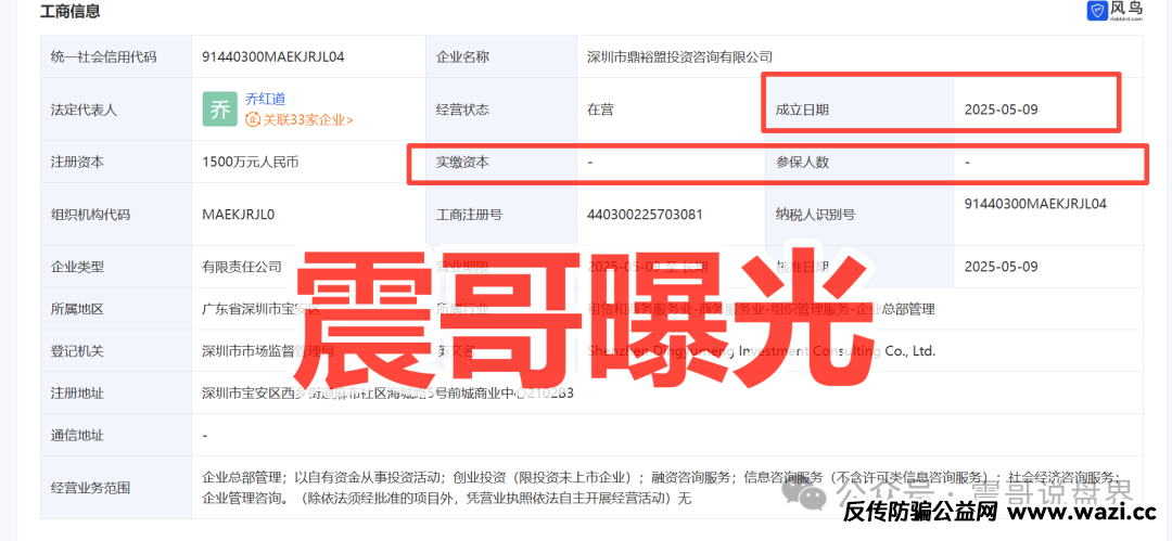 再来看看他们包装的鼎裕盟股神杨岩泽,他们投诉文章的主体是深圳市鼎裕盟投资咨询有限公司,25年5月才成立,实缴0元,社保人数0人,就是个空壳公司。还宣称22年就开始合作了,穿越时空梦里合作吗?