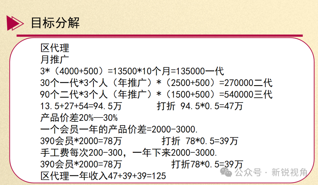 另外该代理商在录音中提到的销售推广模式也存在很大涉传问题。下面我们通过代理商发来的PPT截图直观的了解一下双迪众创美业的销售模式。